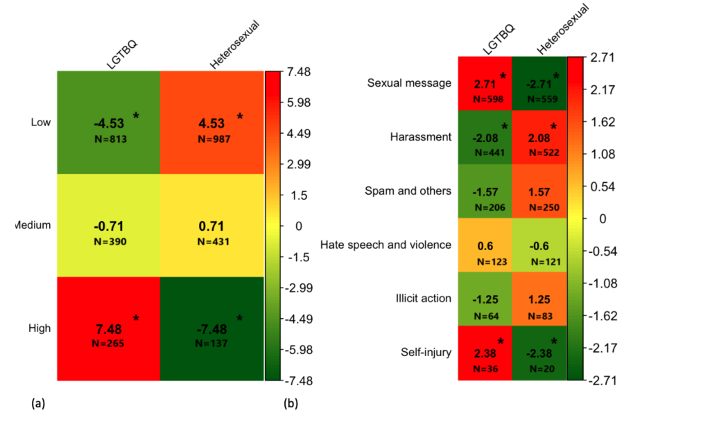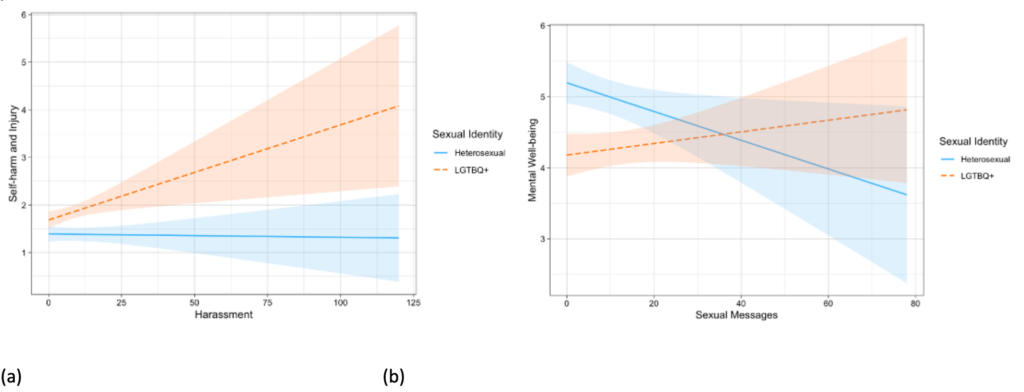Positive and Negative Mental Health Impacts: We found a strong link between online harassment and self-harming behaviors among LGBTQ+ youth (Figure 2). Specifically, LGBTQ+ youth who received more online harassment reported higher levels of self-harm and injury compared to their heterosexual peers. However, the LGBTQ+ youth who received more sexually risky messages, such as explicit adult content (e.g., photos and videos), porn website URLs, and sexual texts, reported higher levels of mental well-being, contrary to their heterosexual counterparts who experienced a decline in mental well-being. One possible explanation for this paradox is that LGBTQ+ youth use private DMs to engage in positive sexual interactions with their peers, which helped them in meeting their needs for validation and contributed positively to their mental well-being.