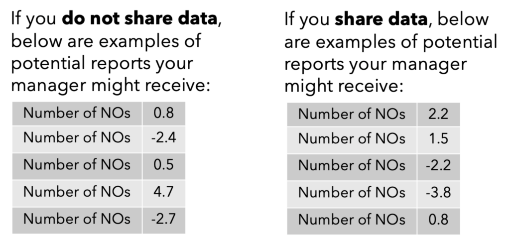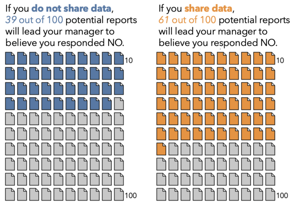 If you share data, 61 out of 100 potential DP outputs will lead your manager to believe you responded NO.